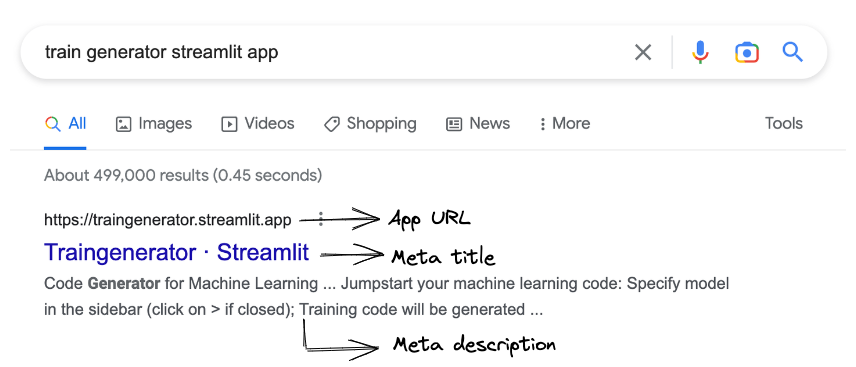 From our observations, search engines seem to favor the content in both st.header and st.text over st.title. If you put a description at the top of your app under st.header or st.text, there’s a good chance search engines will use this for the meta description.